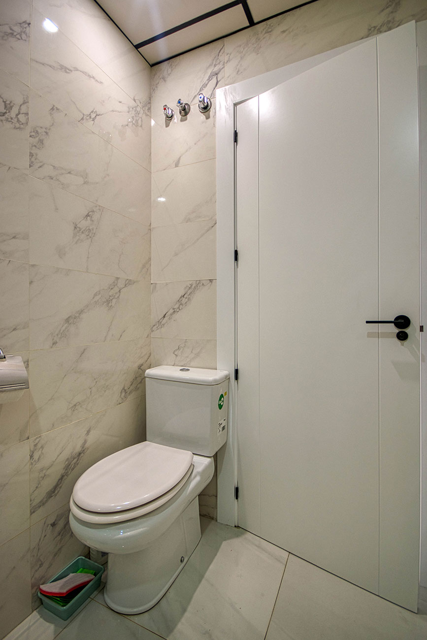 Wohnzimmer ausgestattet mit Klimaanlage, Flachbildfernseher, Schlafsofa und amerikanischer Küche mit Geräten und Utensilien.