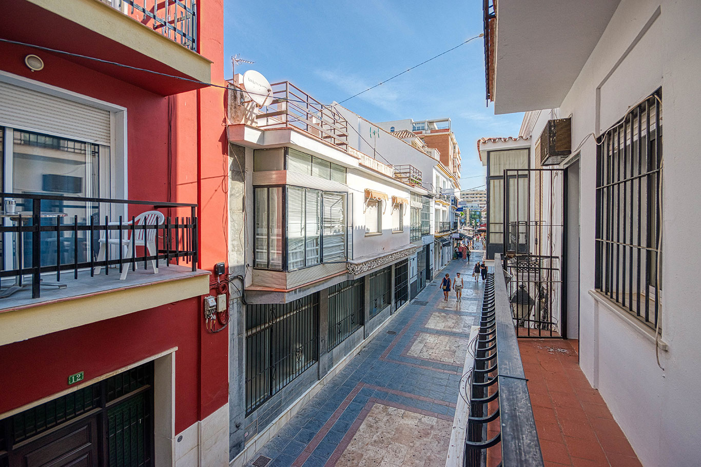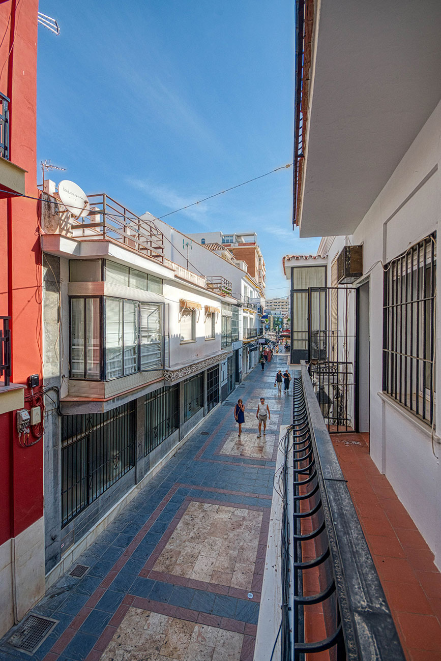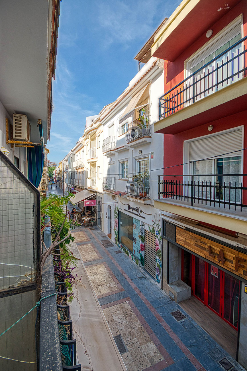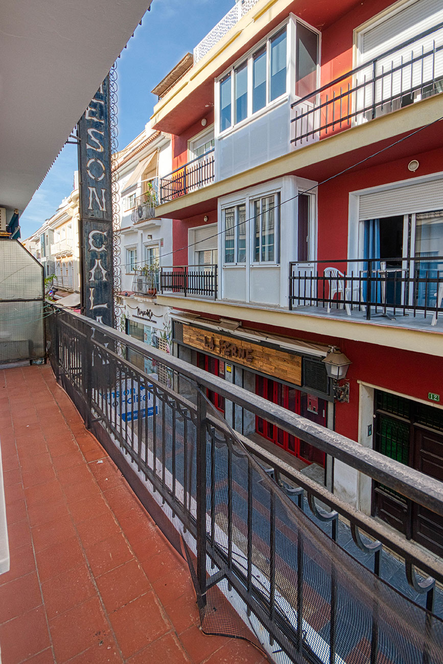 The property features 3 bedrooms, 1 bathroom, a fully equipped kitchen, a spacious living-dining room, and a balcony overlooking a quiet pedestrian street. Ideal for those looking for a central and accessible stay on the Costa del Sol.