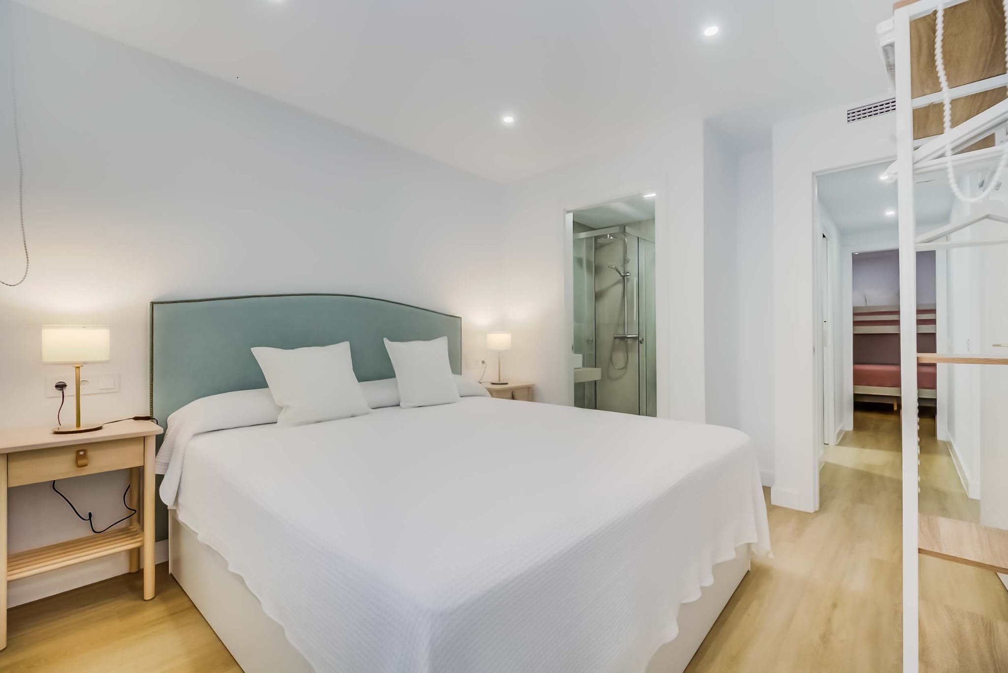 - Master bedroom with a large double bed and direct access to a modern bathroom.