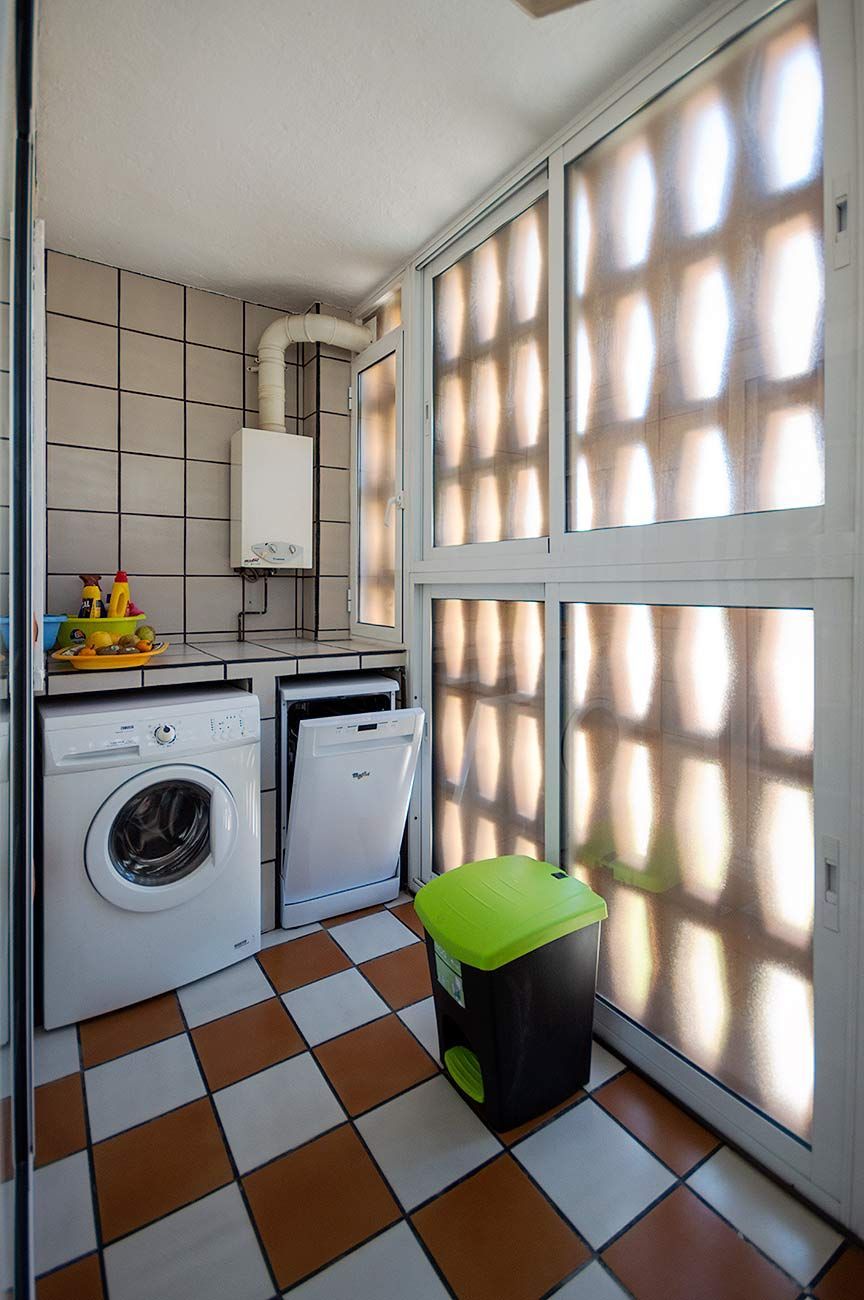In the laundry room, there is a washing machine, a compact dishwasher, and a gas water heater.