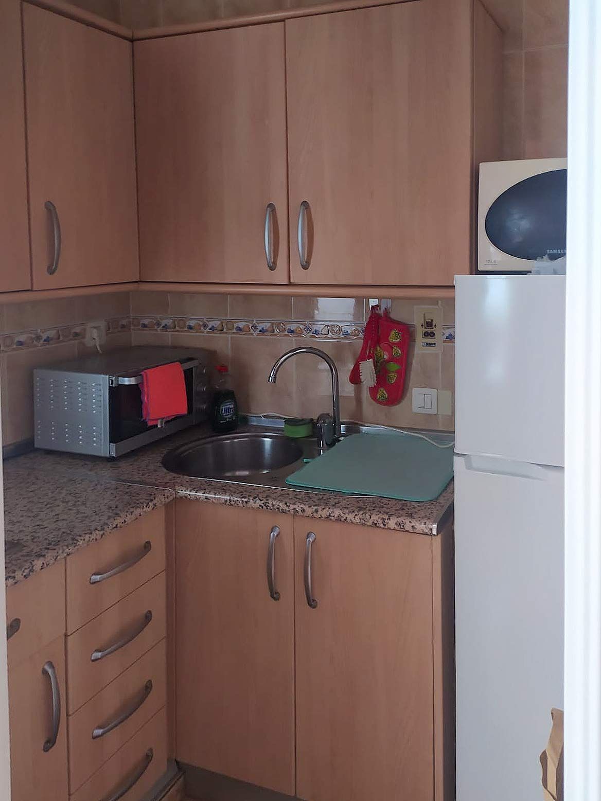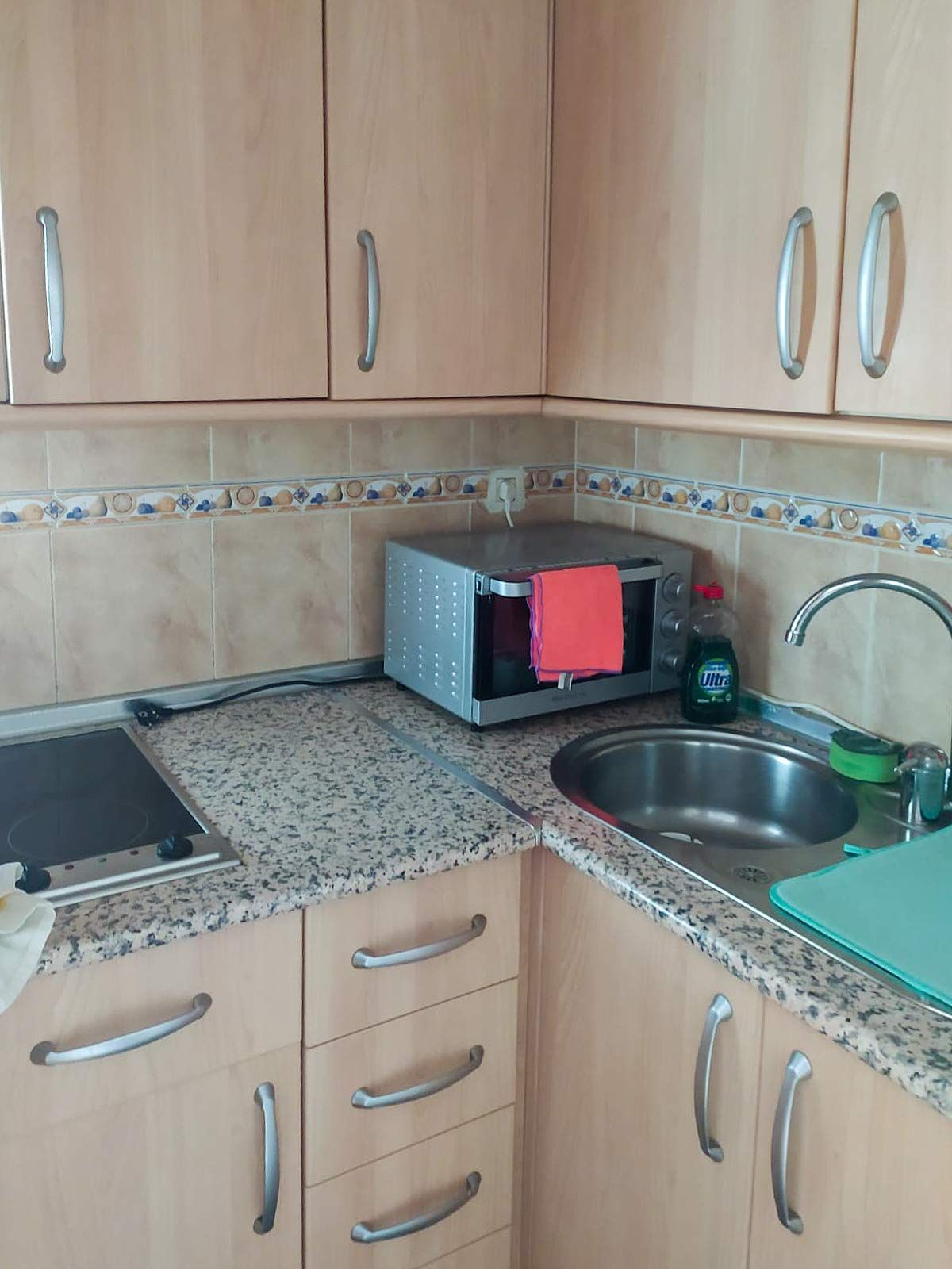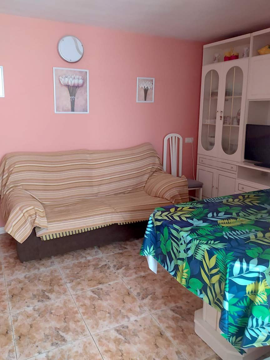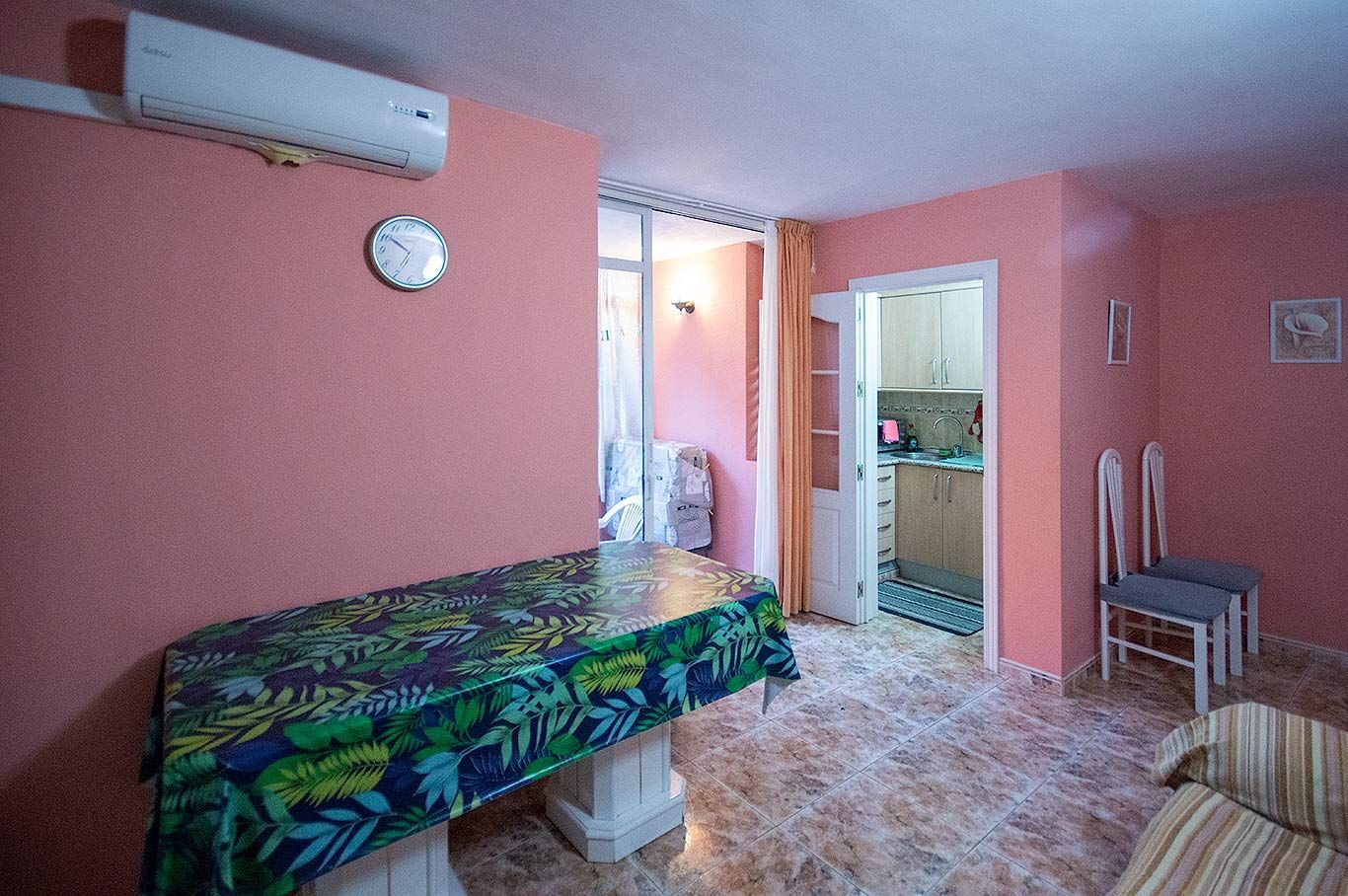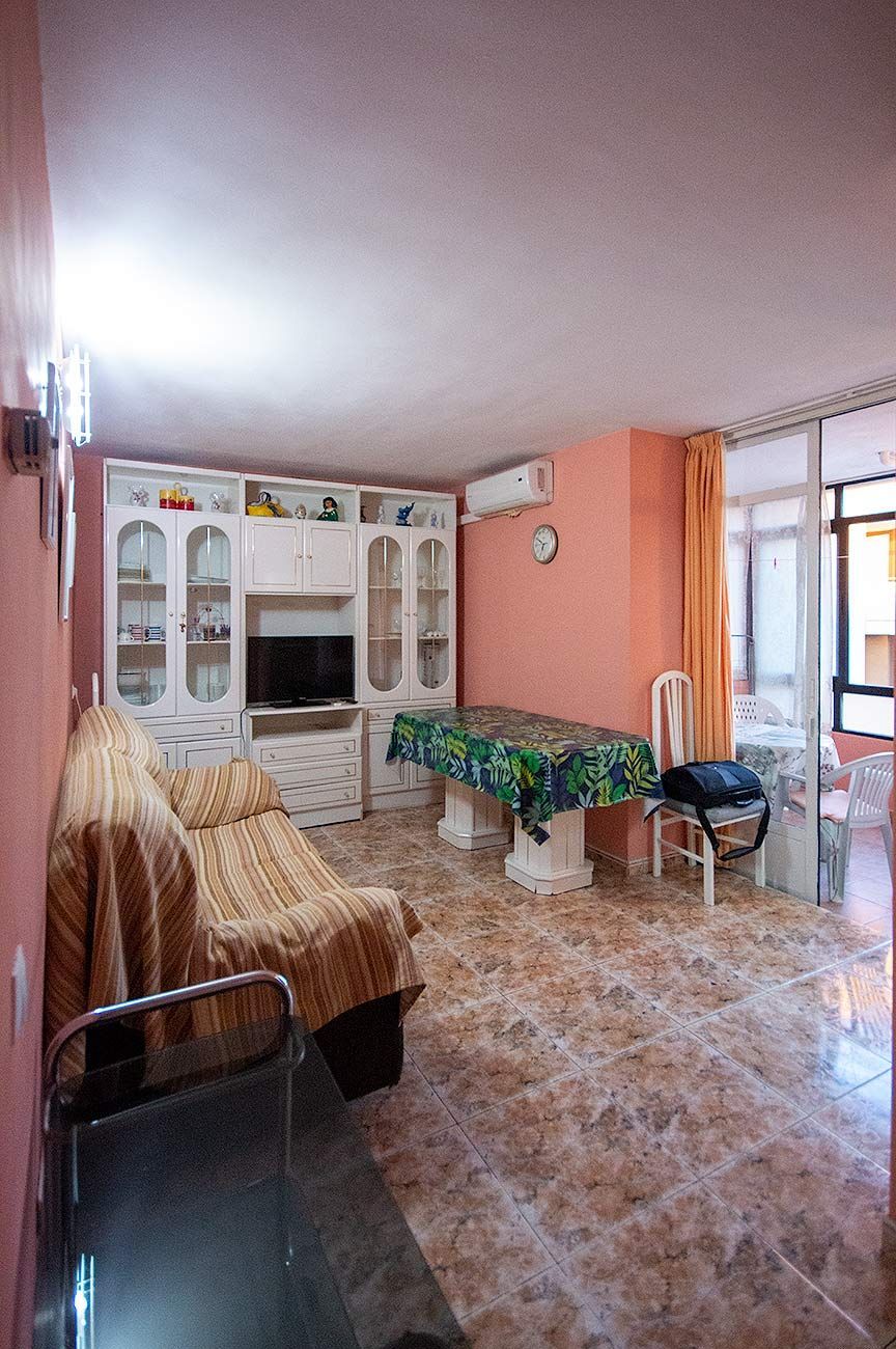 Air conditioning in the living room, flat-screen TV, and an open kitchen