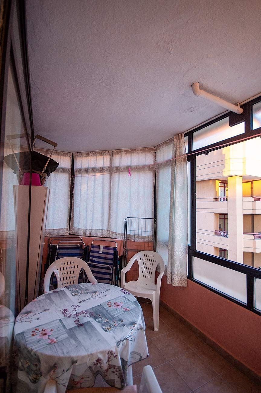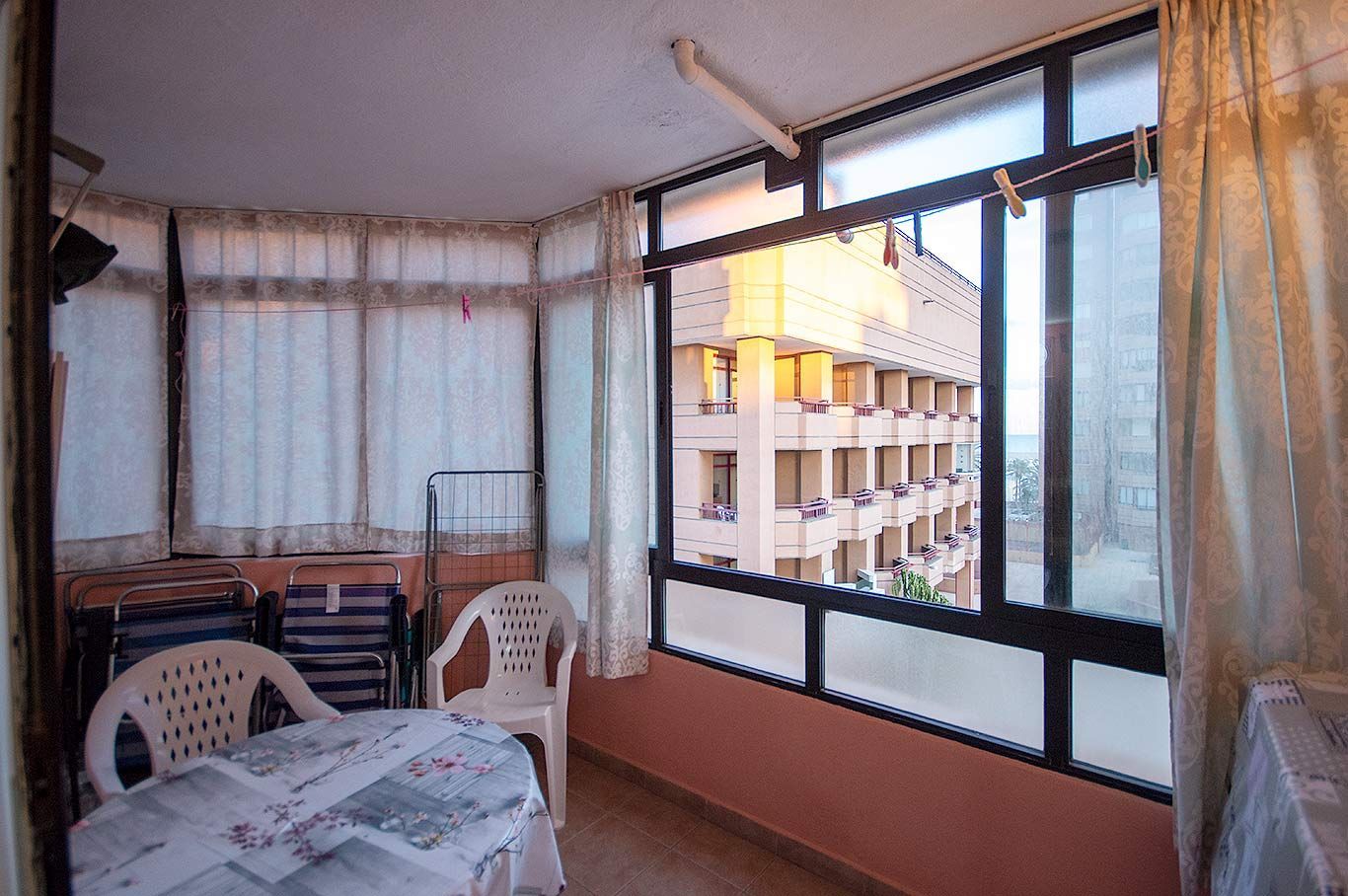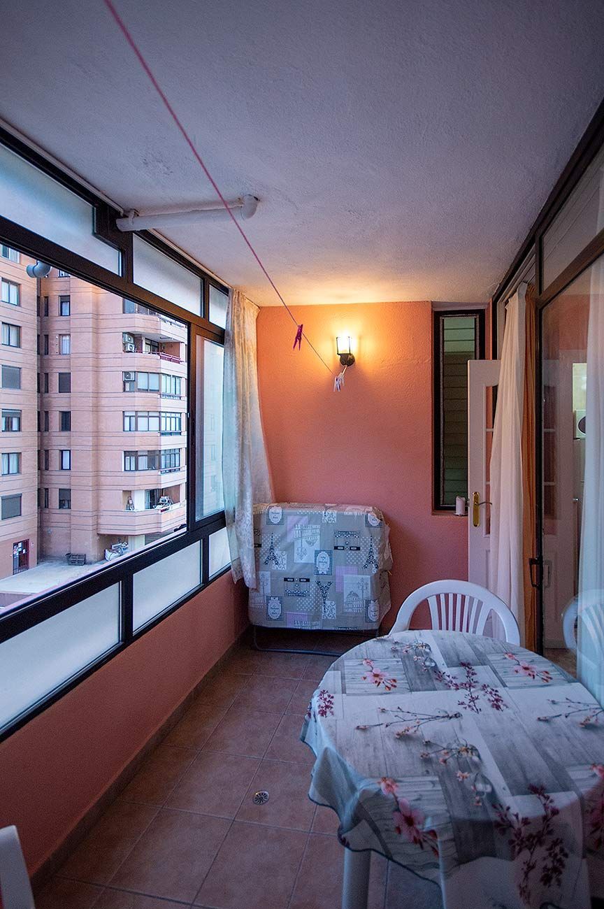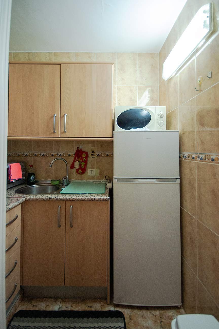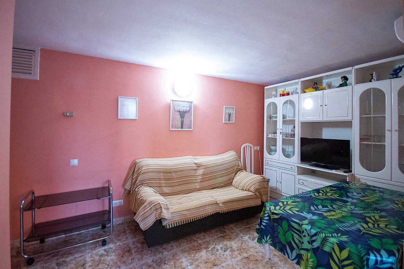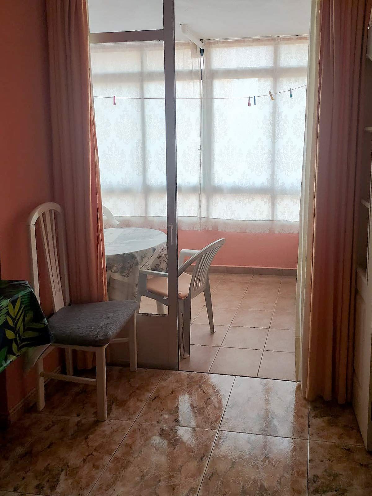 Air conditioning in the living room, flat-screen TV, and an open kitchen