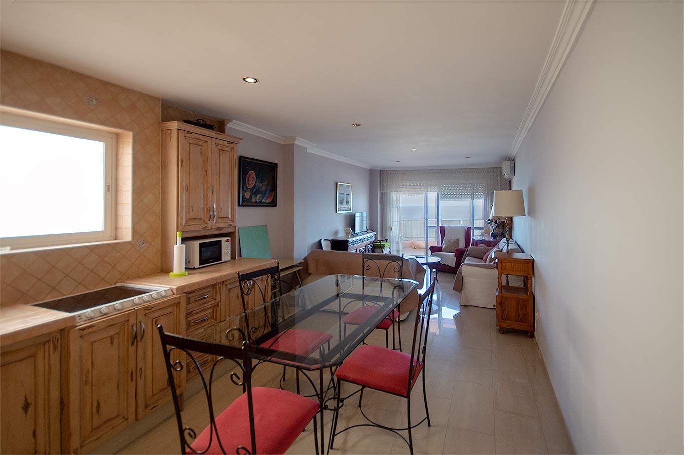 Living room with an equipped American kitchen with appliances and air conditioning (cold/heat)