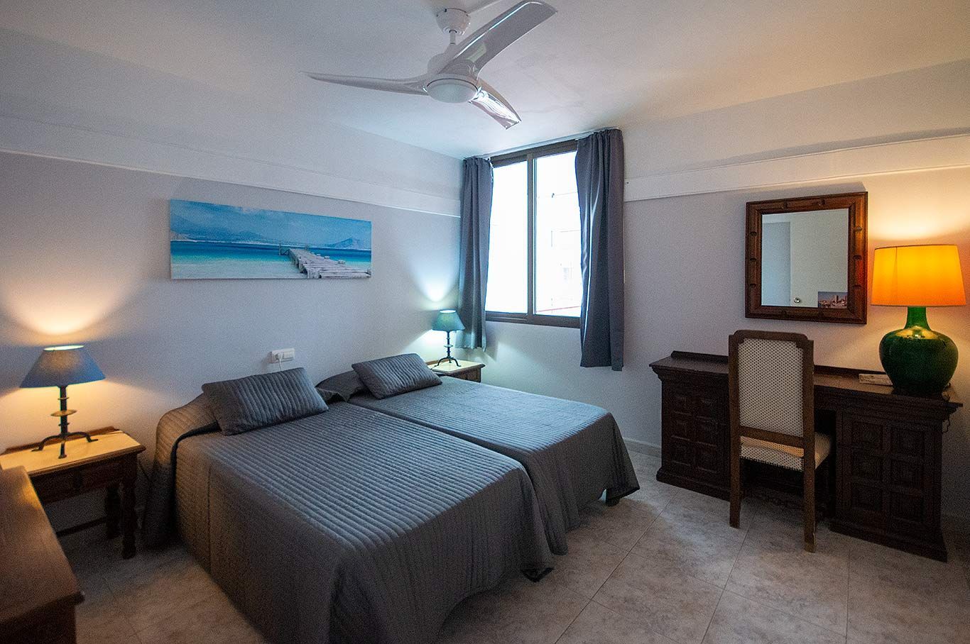 Bathroom with shower tray and the bedroom comes with 2 single beds, a desk, and a built-in wardrobe.