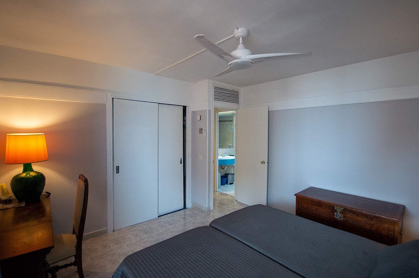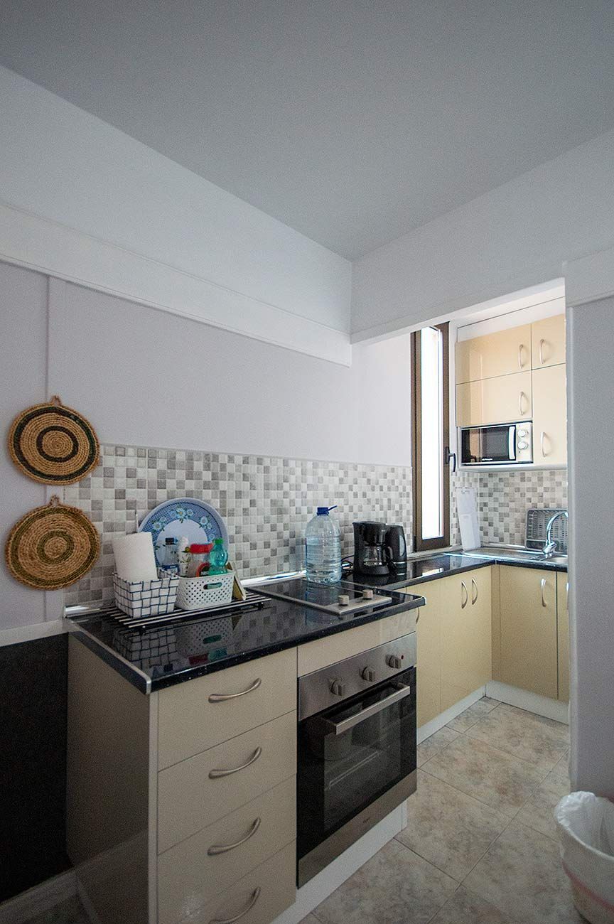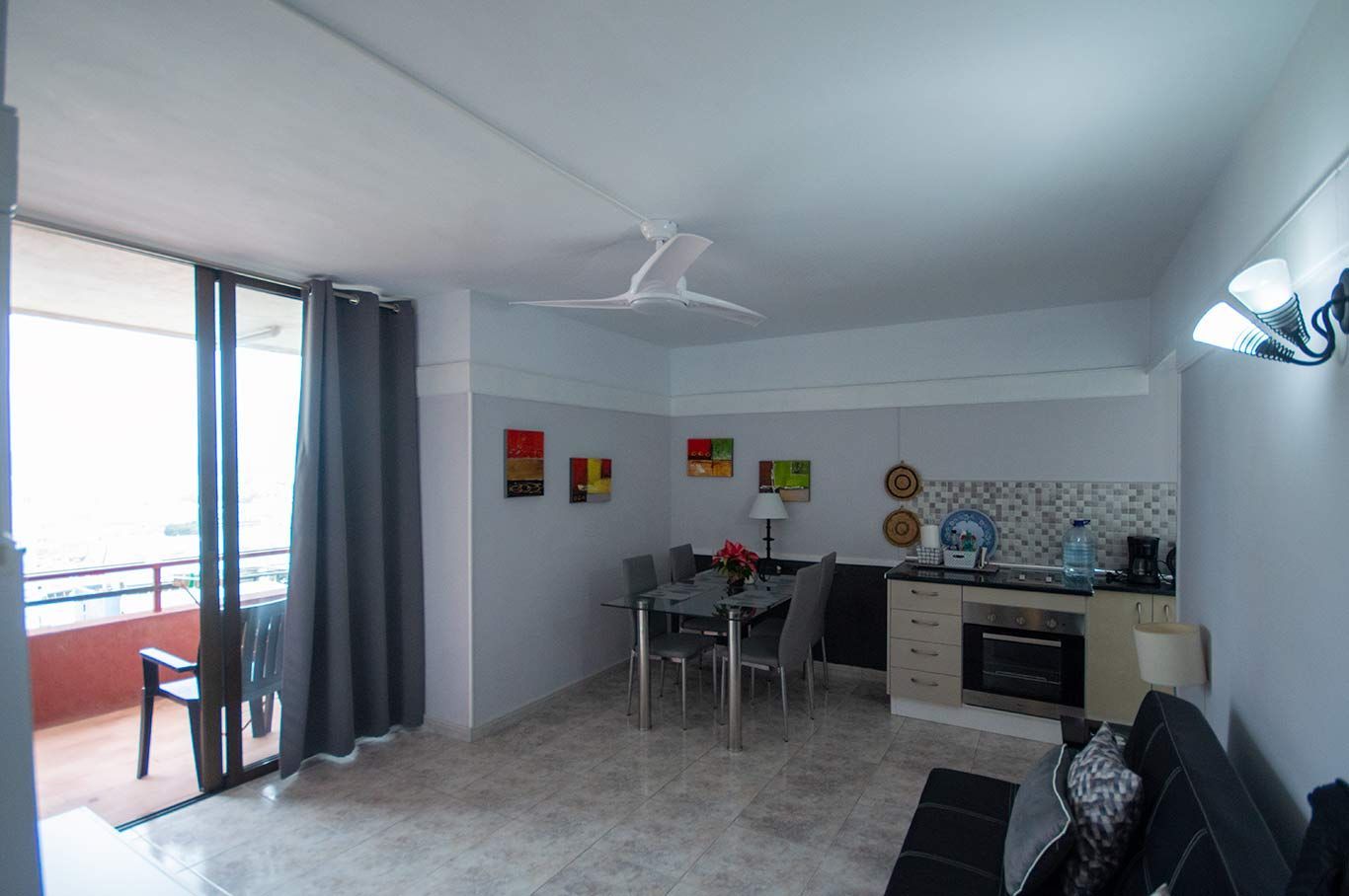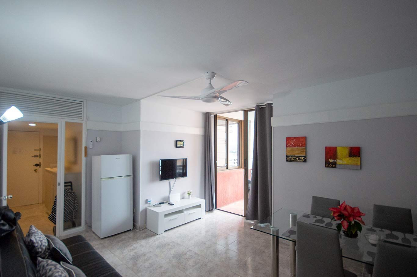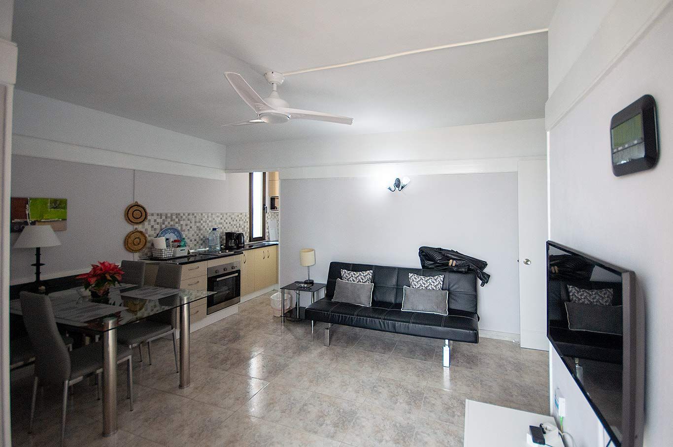 In the living room, there is a flat-screen TV, ceiling fan, and a comfortable sofa bed, allowing for a capacity of up to 4 people in the apartment.