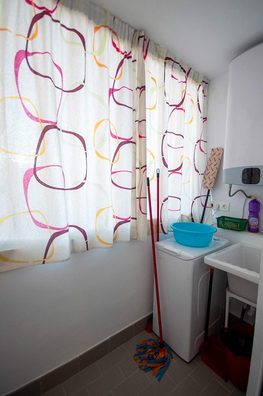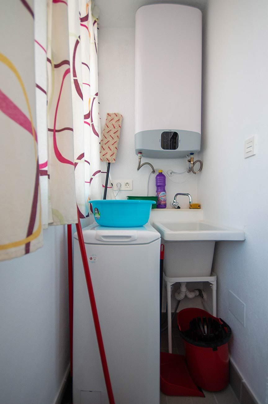 and the bedroom has 2 single beds and a small laundry area.