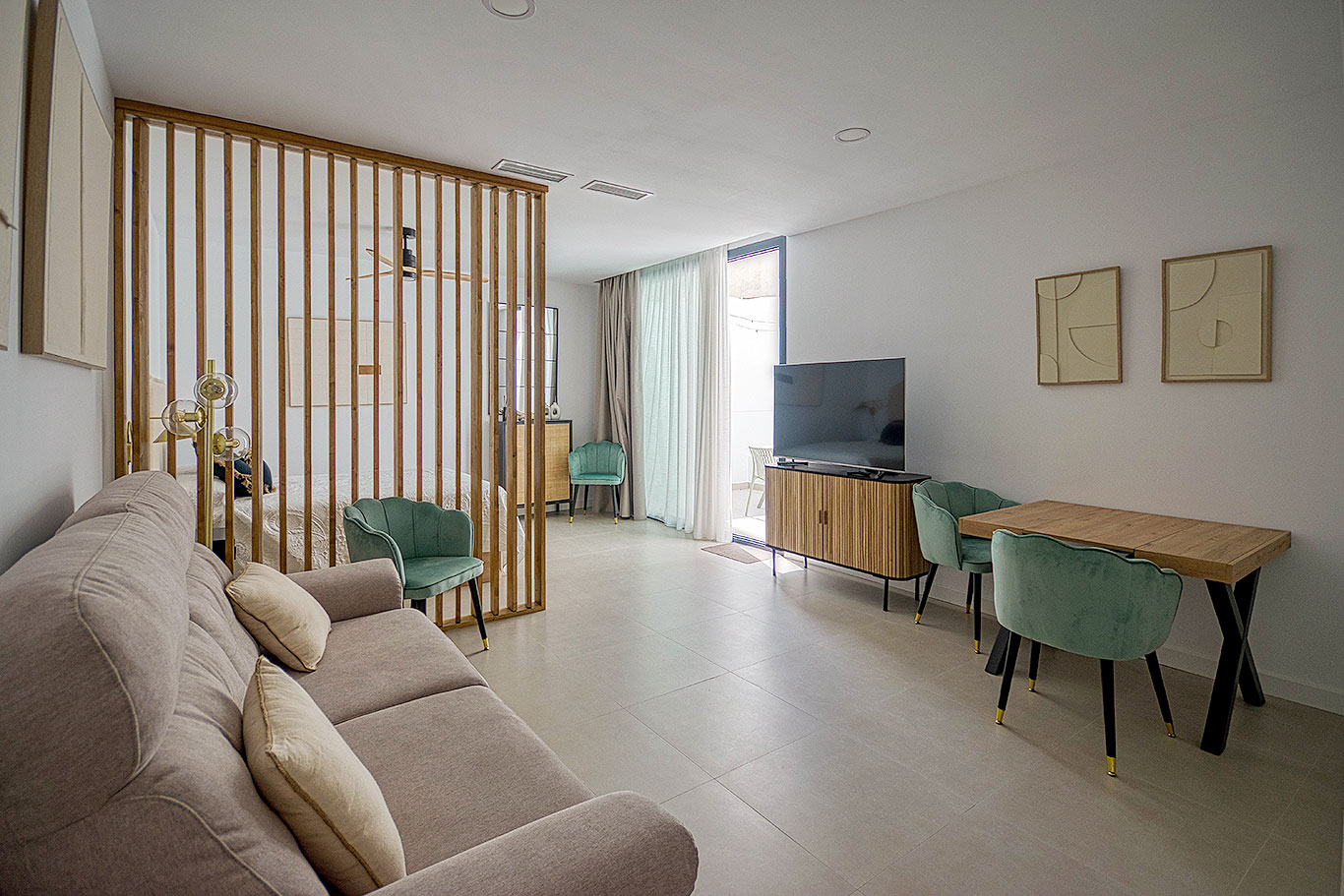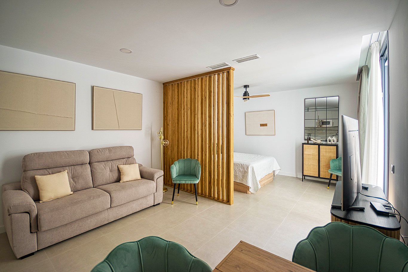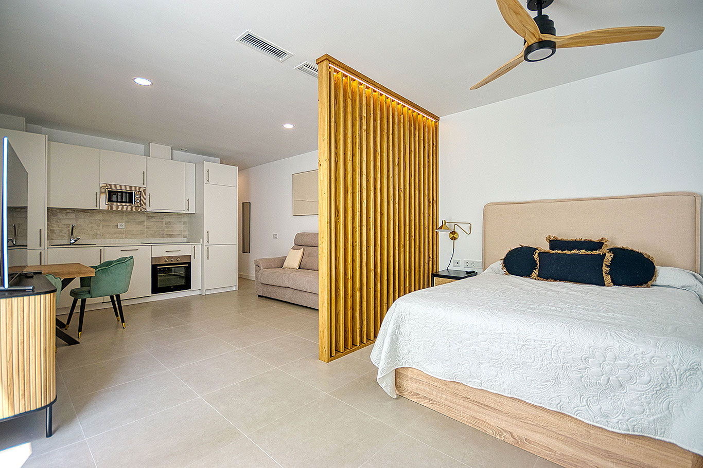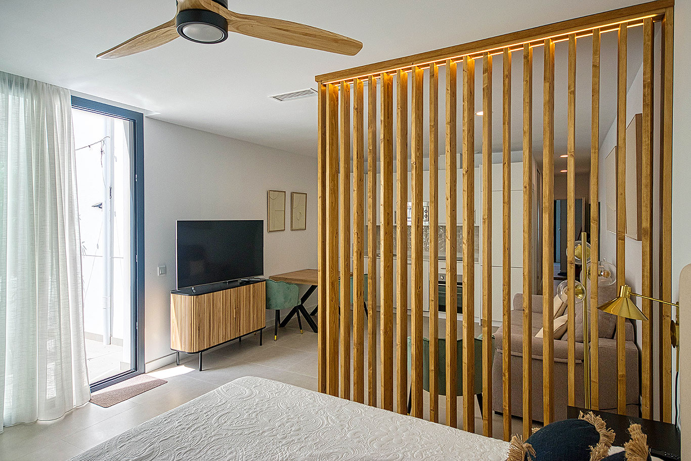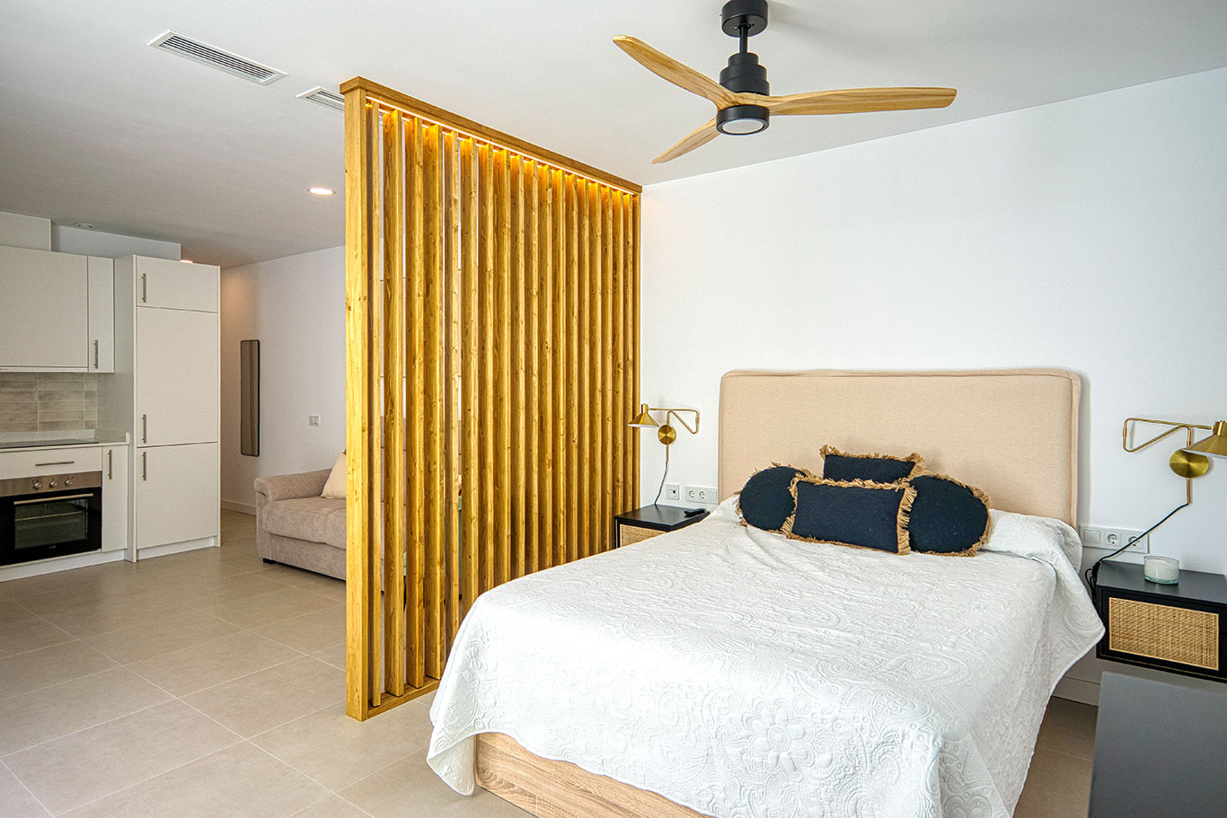 - Open-plan studio with a bedroom area separated by an elegant wooden screen