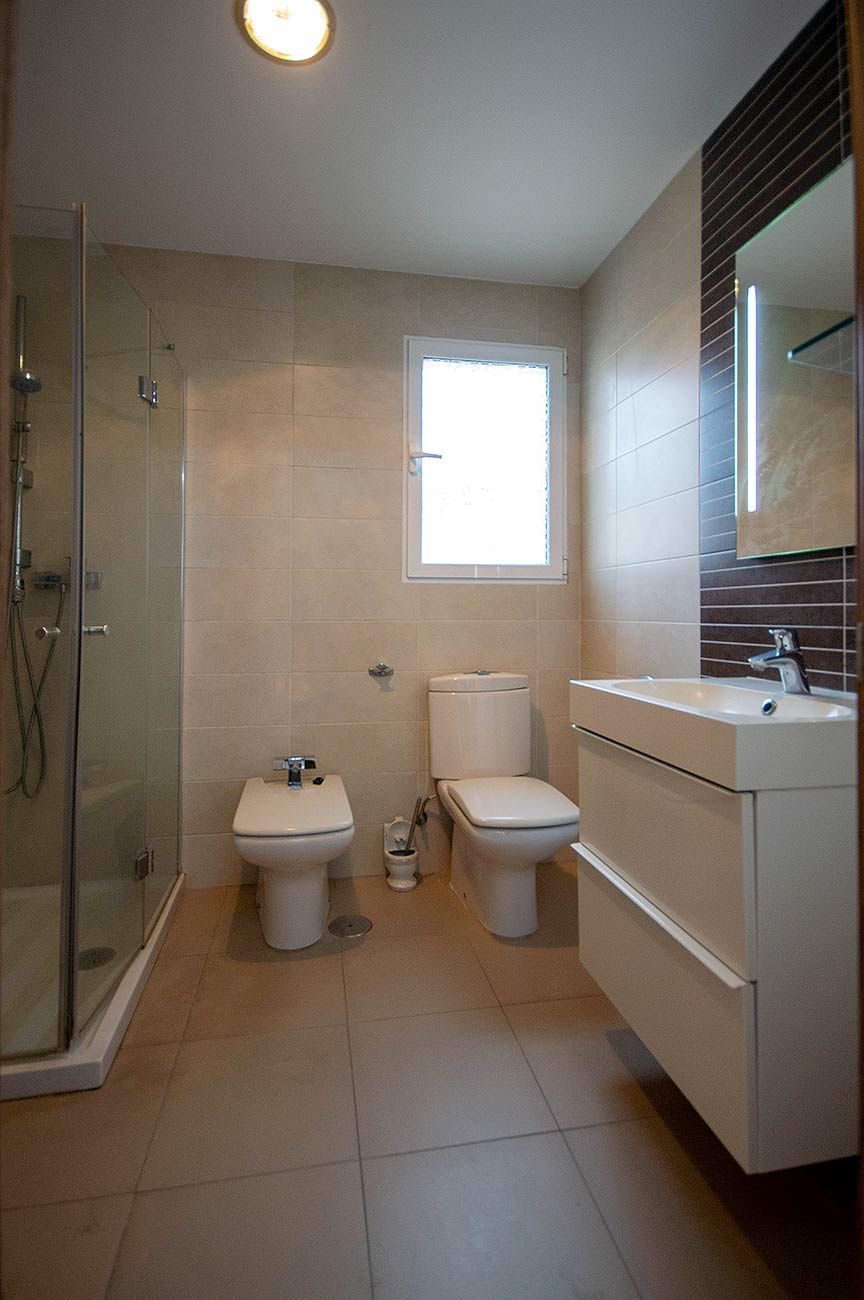 The lower apartment, which is more spacious, consists of three bedrooms, a living-dining room, an independent kitchen, one bathroom, and a large outdoor terrace.