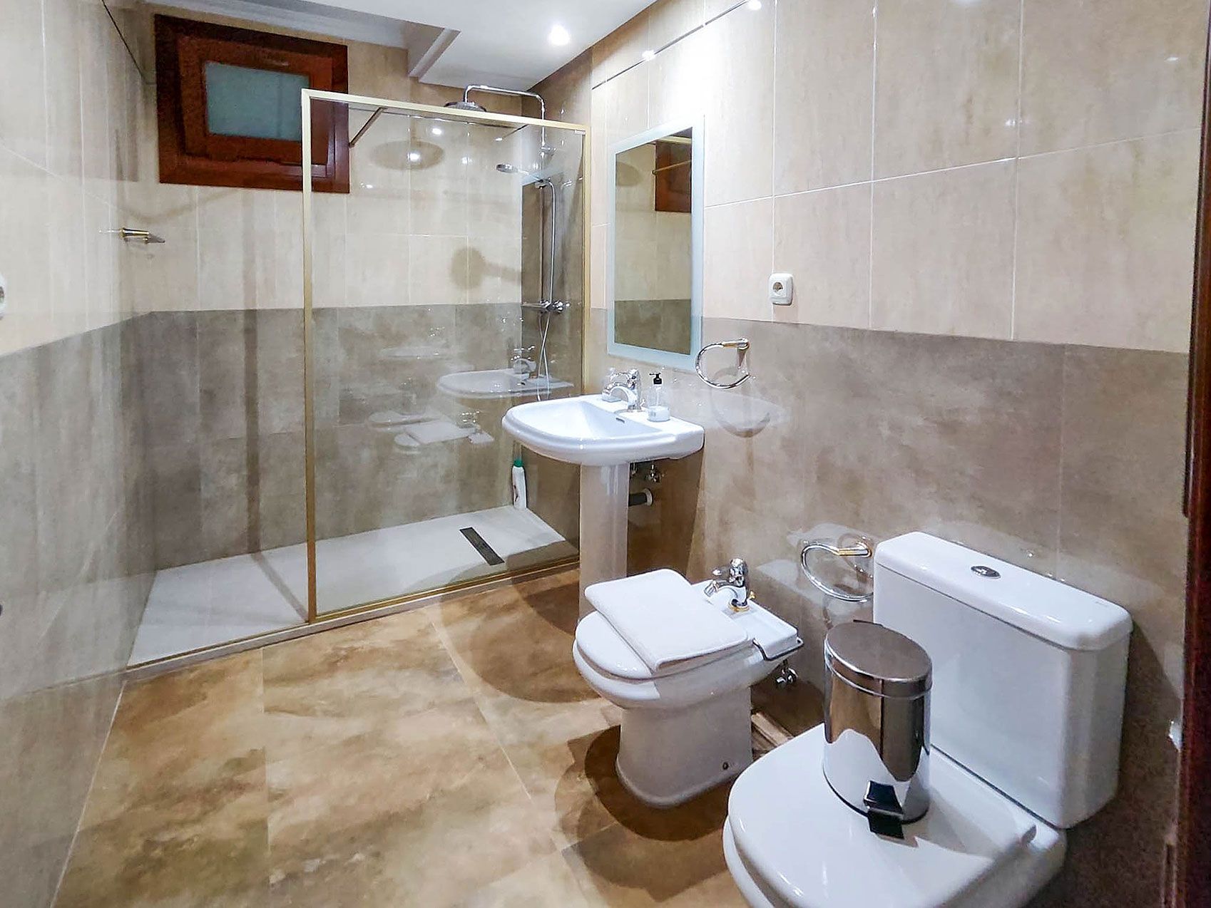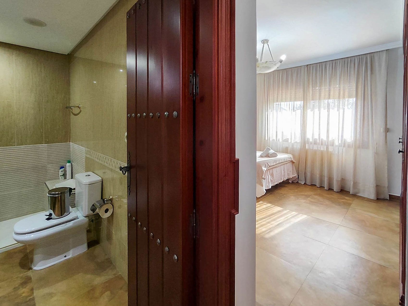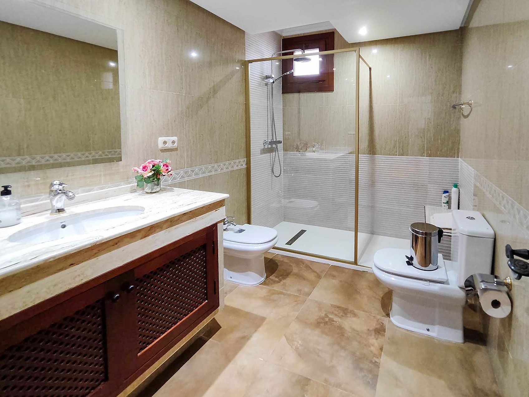 The first floor offers a private retreat with four double bedrooms, all with built-in wardrobes and ensuite bathrooms. The master suite, a true sanctuary, features a jacuzzi, private bathroom, and its own terrace, offering an exclusive getaway within the house. A cold/heat air conditioning system ensures comfort in all seasons.