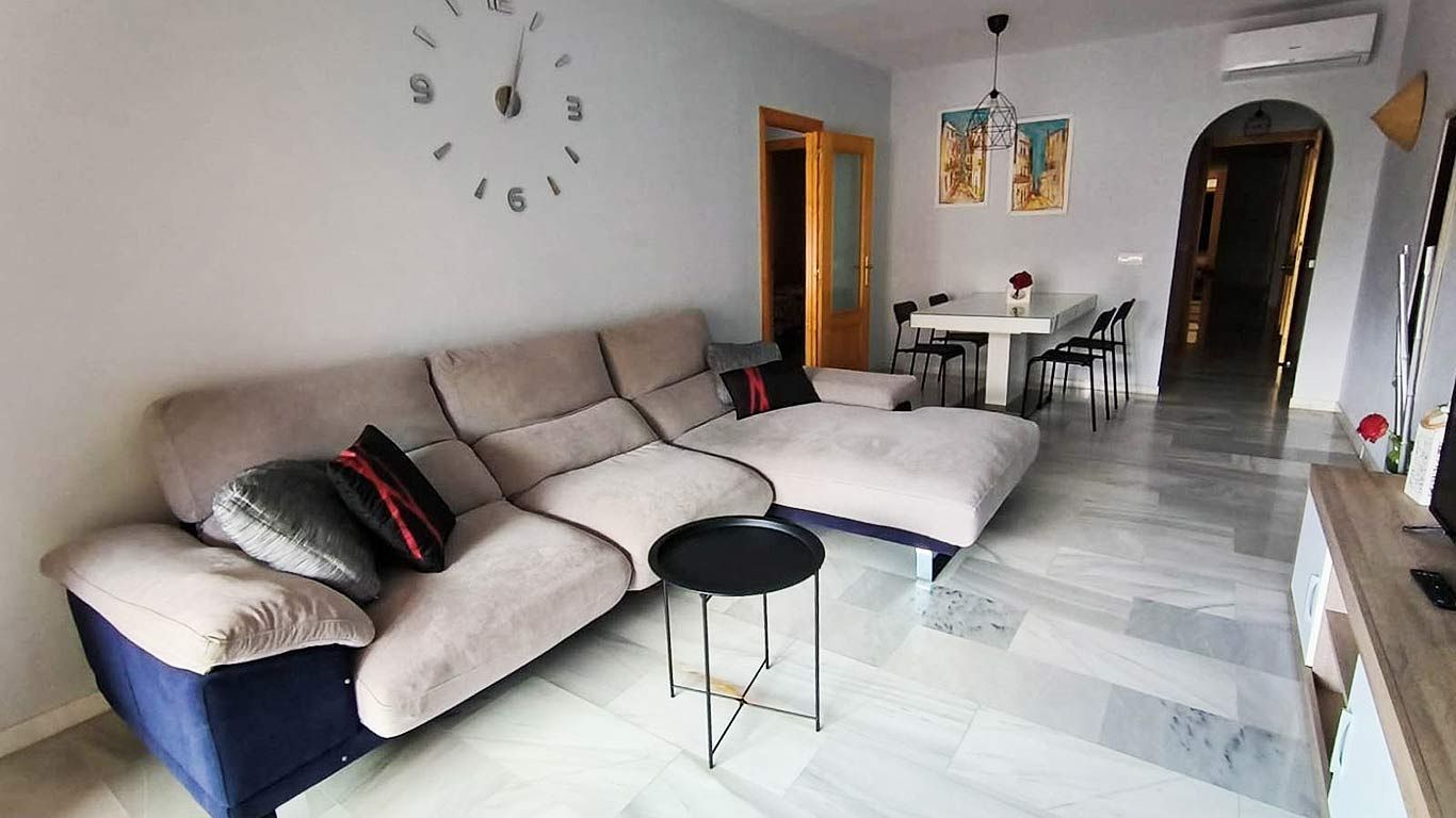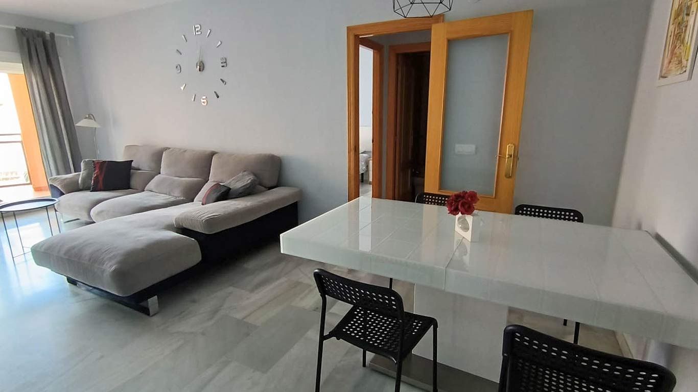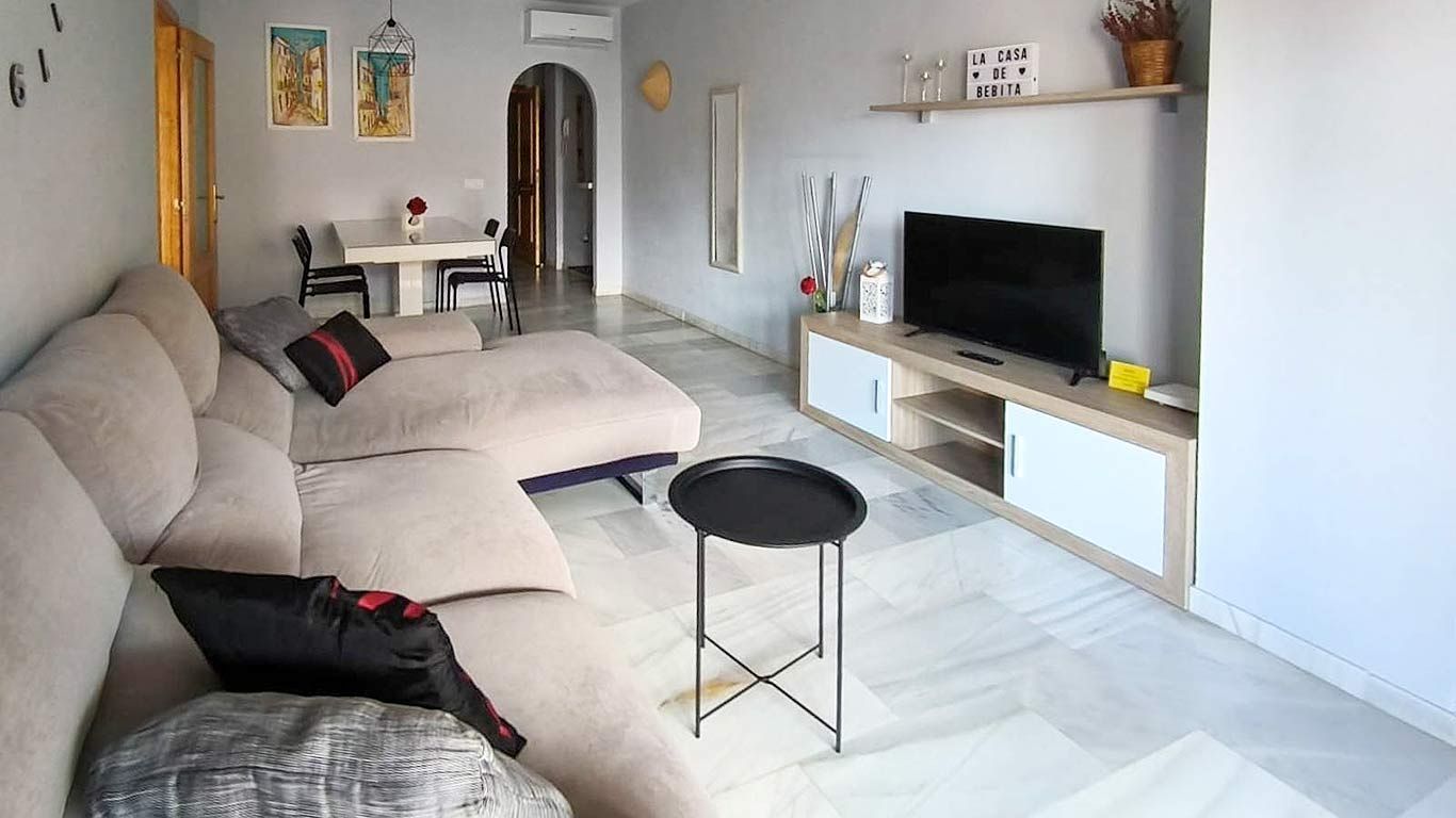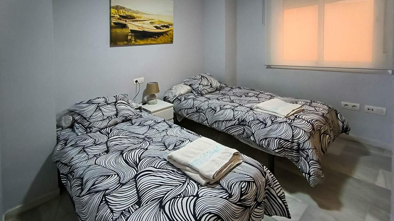 This modern apartment is located in a quiet central neighborhood of Fuengirola, close to beaches, Bioparc, water park, shopping and leisure areas. With 84 m² on the first floor, it offers two bedrooms, one with a double bed and another with two single beds, as well as a sofa bed for groups of five people.