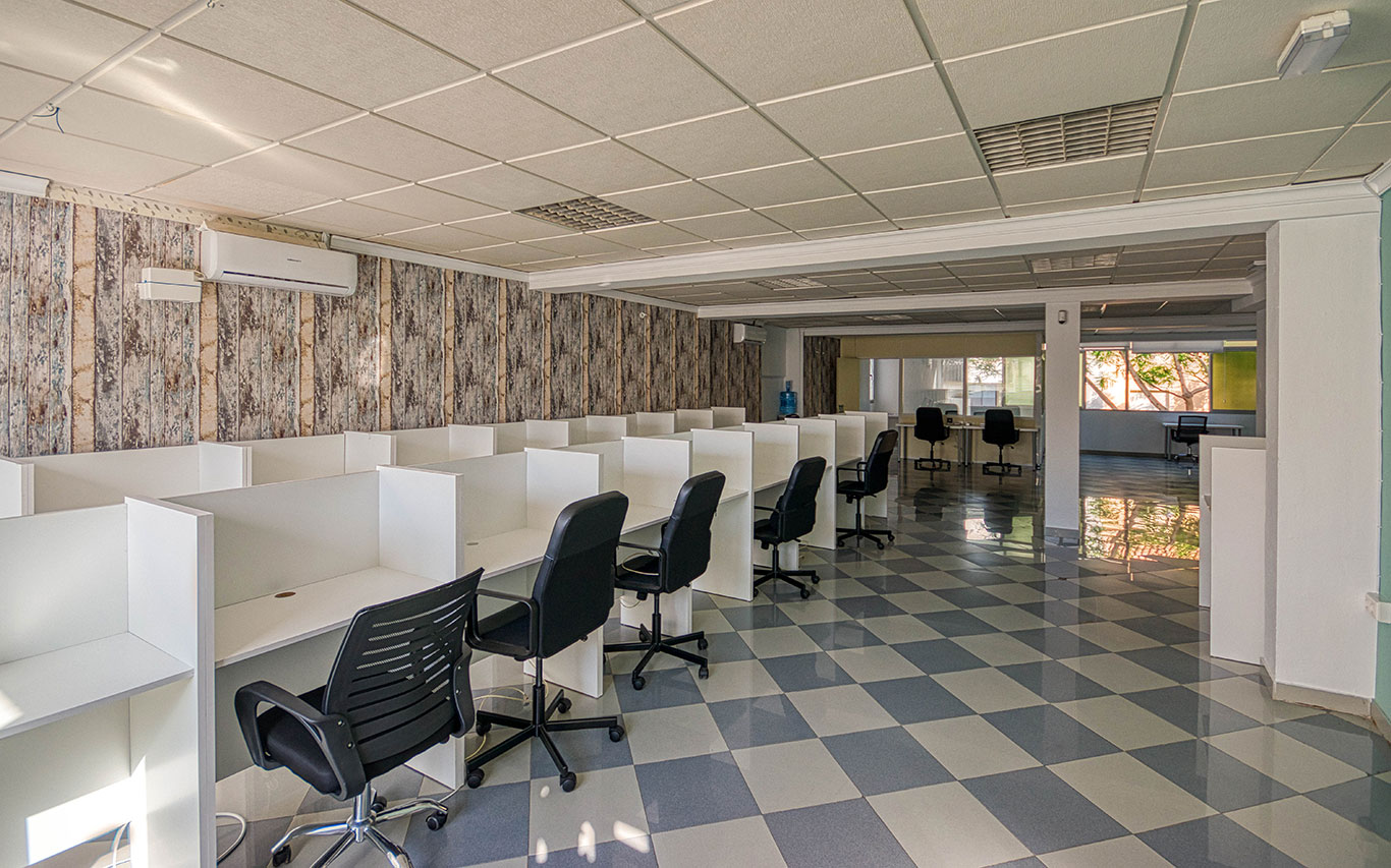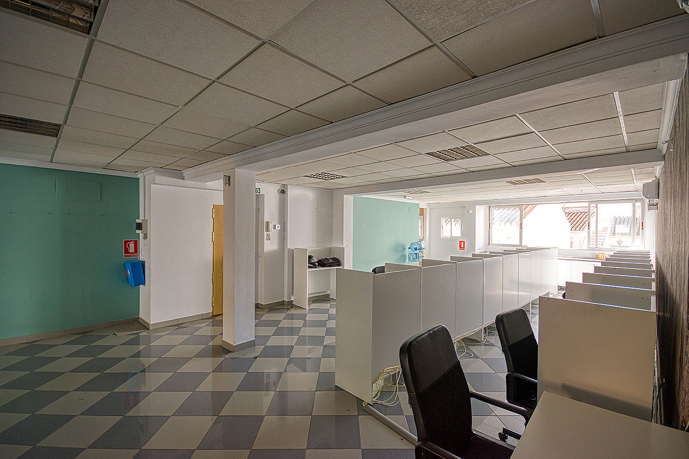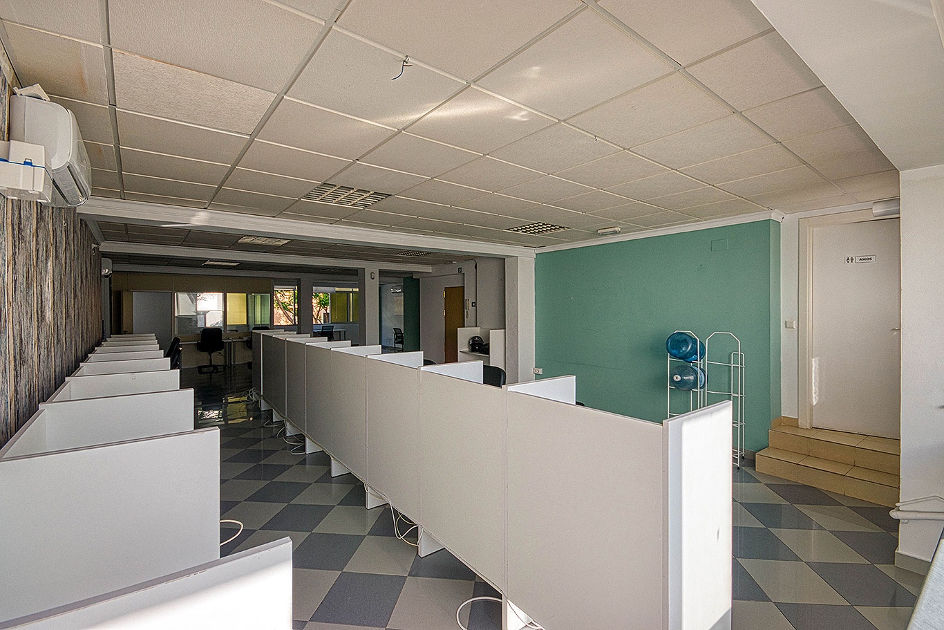 Office for rent on the first floor, very central, on Calle San Rafael in Fuengirola. The office is open-plan and has approximately 120m², with a separate office. It has central air conditioning and is equipped for telemarketing activities, including tables with partitions and chairs. Additionally, it has a kitchen for preparing snacks and coffee.