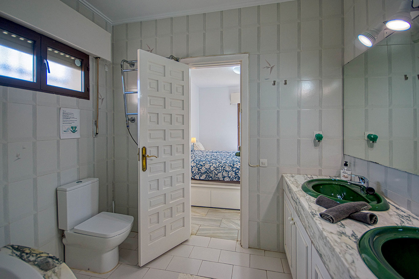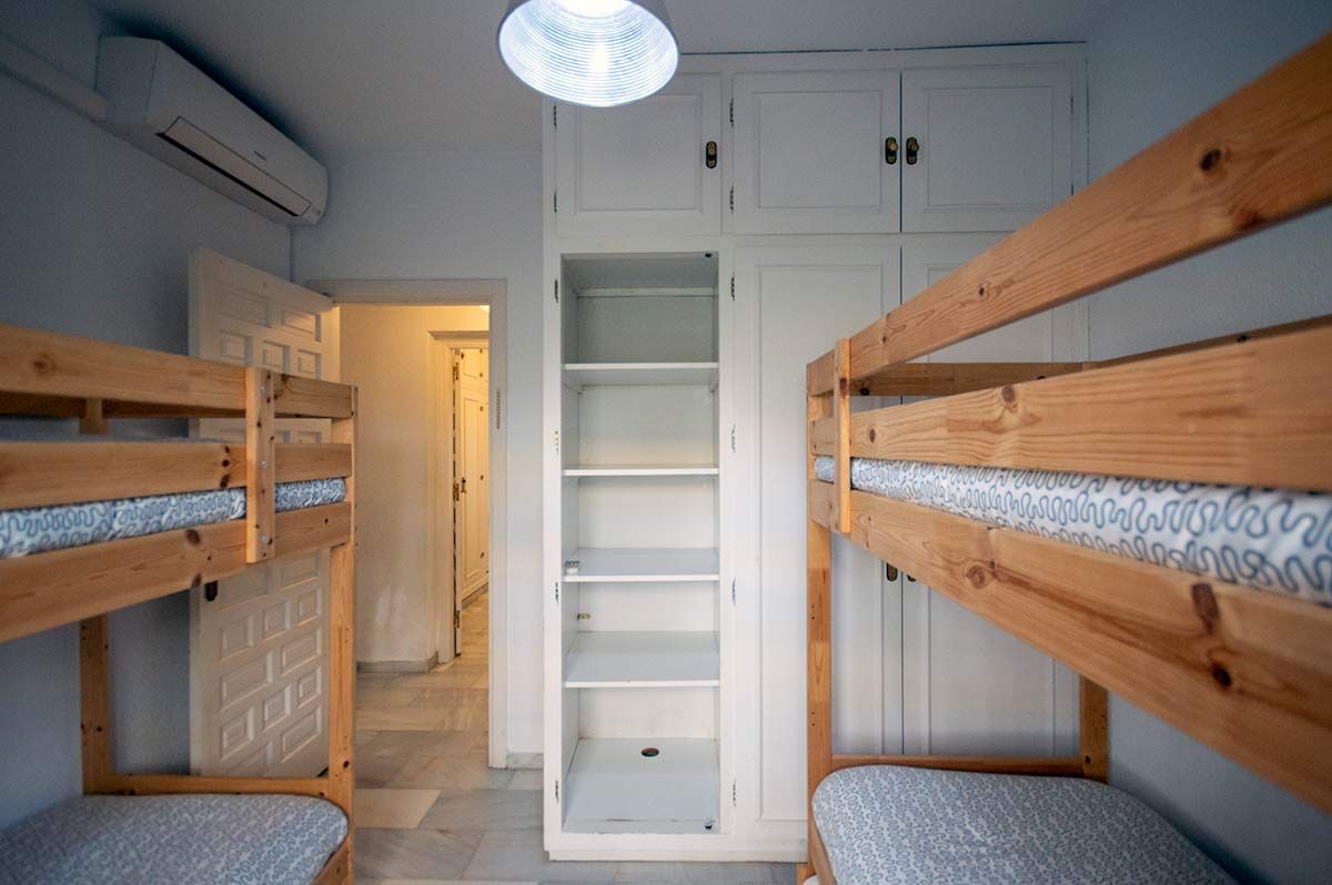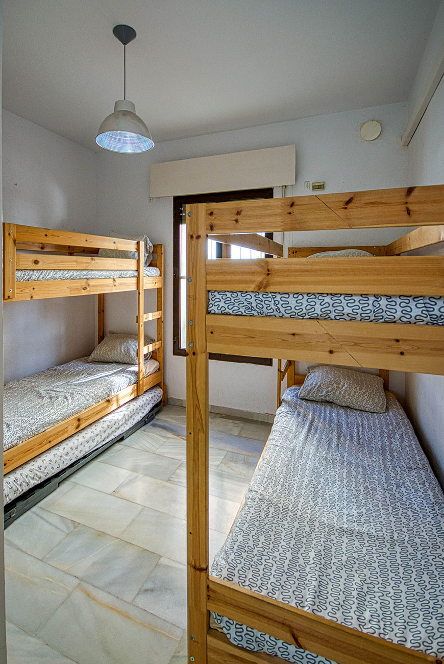 It has three bedrooms, one with a double bed, the main one with 3 single beds, and the third for children with 2 bunk beds and an additional bed (capacity of 6-9 people)