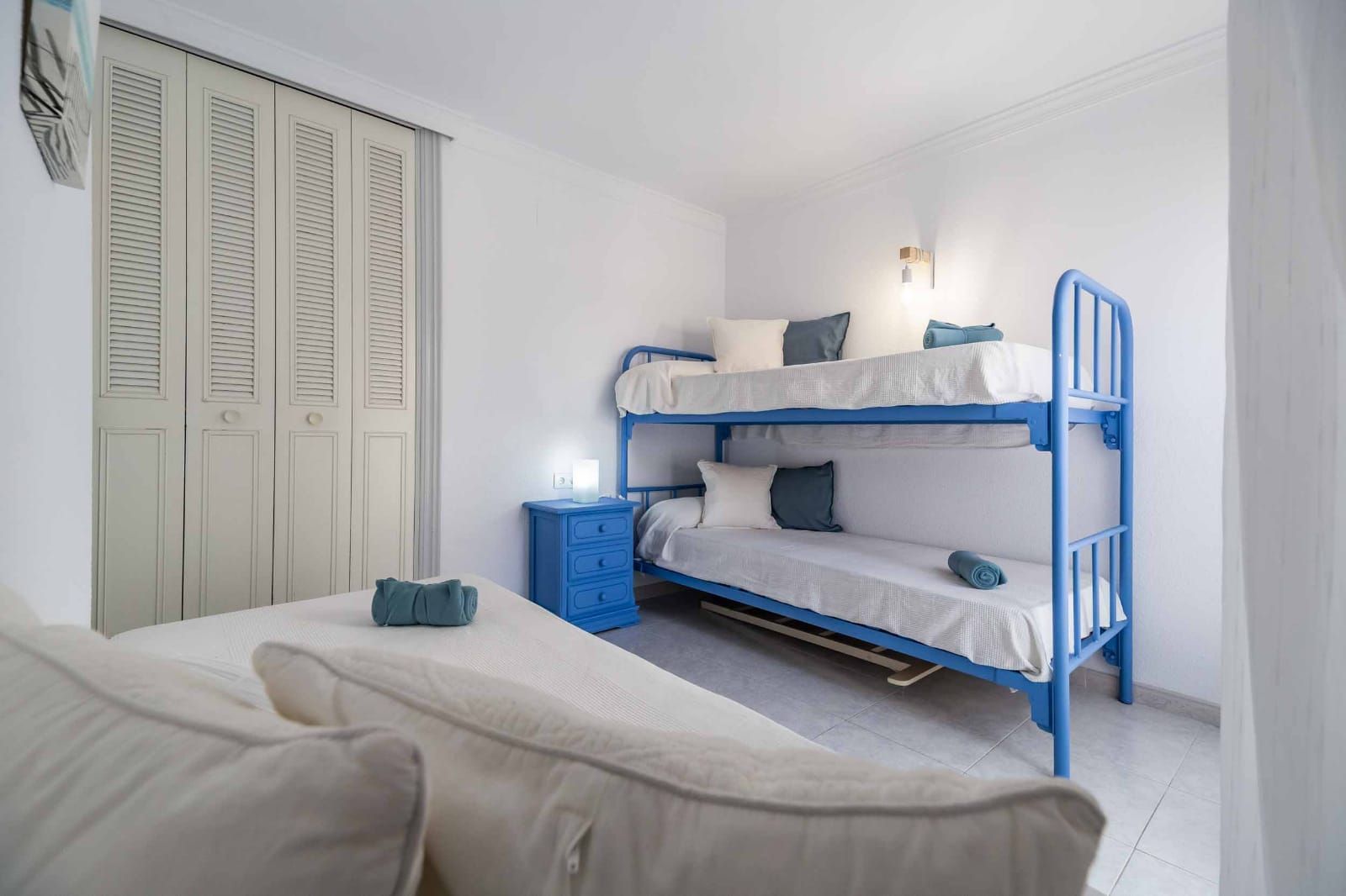 Toisessa makuuhuoneessa on kolme sänkyä, joista kaksi on kerrossängyn muodossa ja yksi on yksittäinen, mikä tekee siitä ihanteellisen vaihtoehdon perheille tai ryhmille.