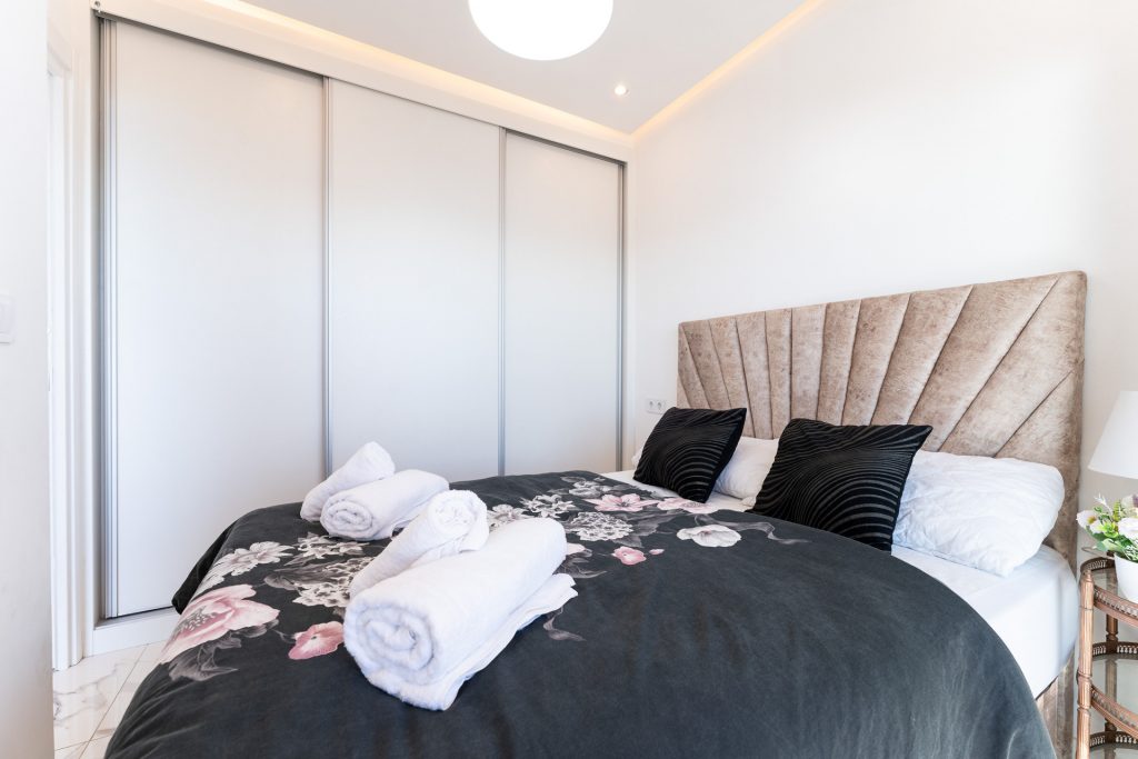 La vivienda cuenta con salón-comedor con cocina integrada, muy soleado y funcional, aire acondicionado en el salón y cocina completamente equipada. Dispone de dos dormitorios: uno principal con cama doble y salida directa a la terraza, y otro con dos camas individuales. Baño moderno con ducha.