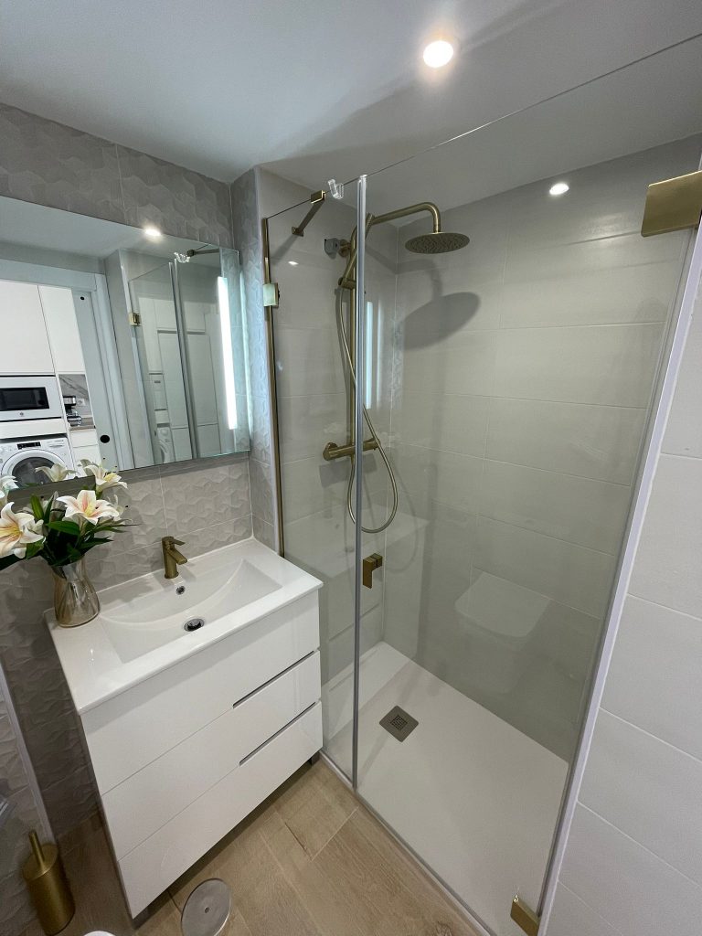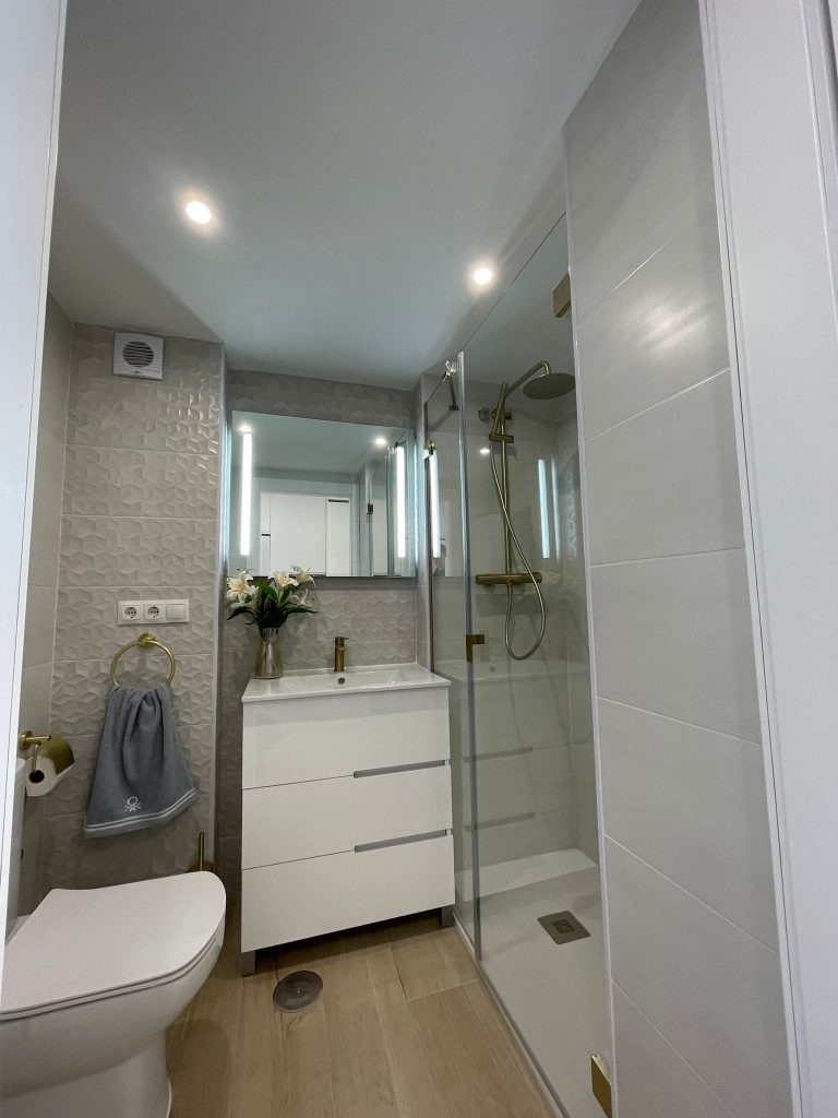 Cuenta con aire acondicionado y lámpara de techo con ventilador, asegurando una temperatura agradable tanto en verano como en invierno. La cocina integrada, completamente nueva, está equipada con horno, microondas, vitrocerámica, lavadora, frigorífico y menaje completo. El baño, de diseño contemporáneo, dispone de una amplia ducha con acabados de alta calidad.